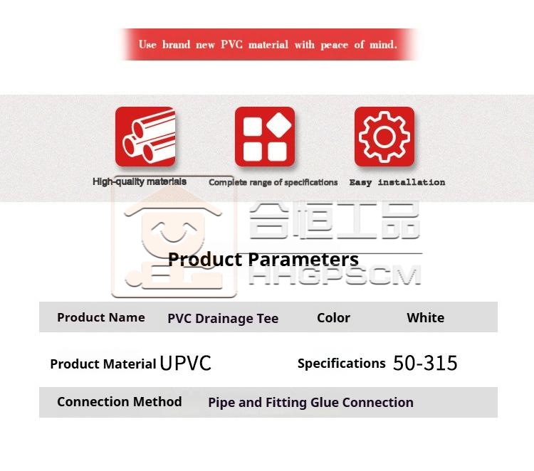 Product name:U-PVC drainage pipe equal diameter tee joint ensures smooth water flow. Made of brand new PVC material, all sizes are thickened.