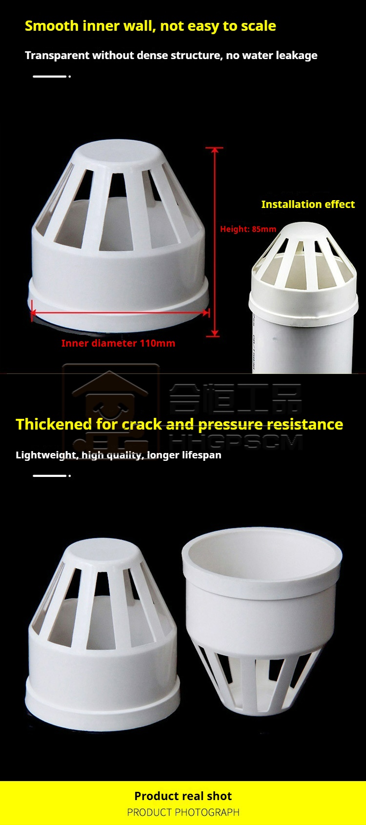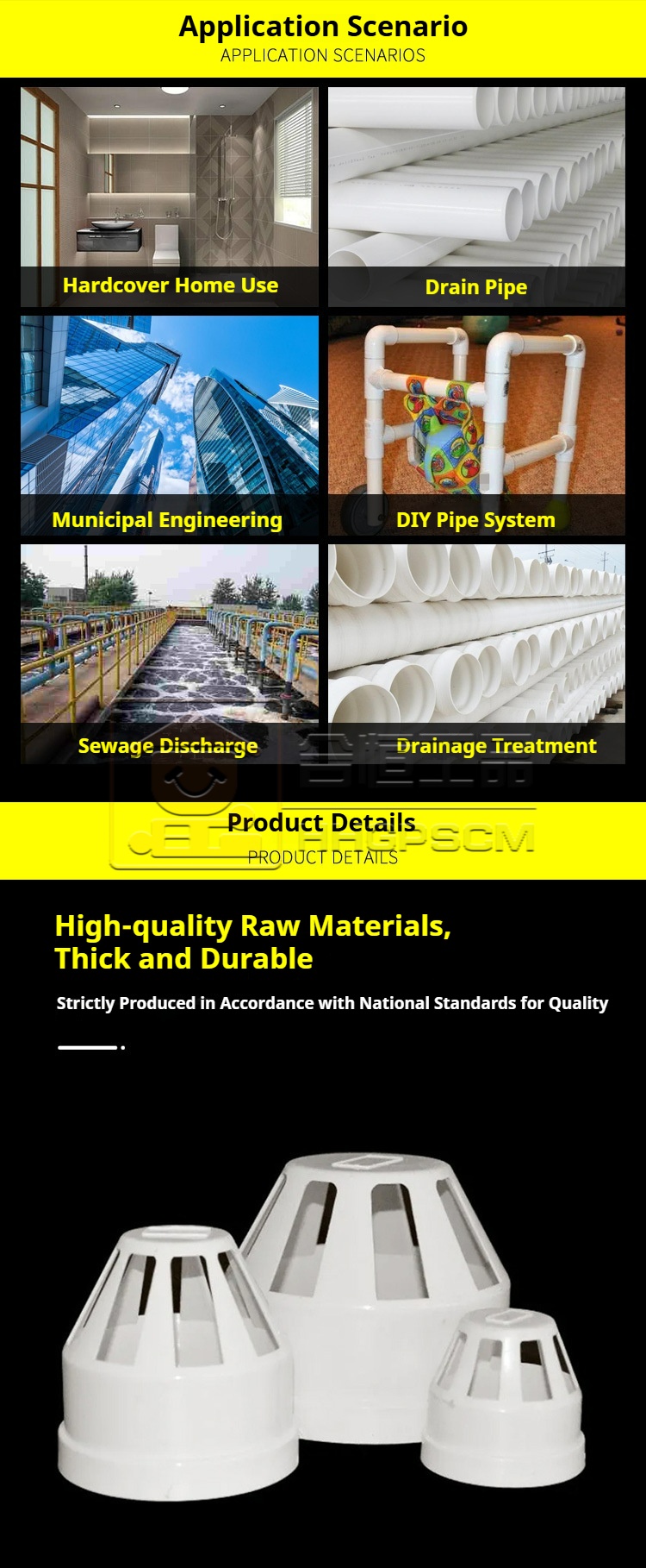 Packing list:1PVC breathable cap, drain pipe, breathable mesh cover, air outlet and exhaust; PVC drain pipe accessories 50 75 110 160