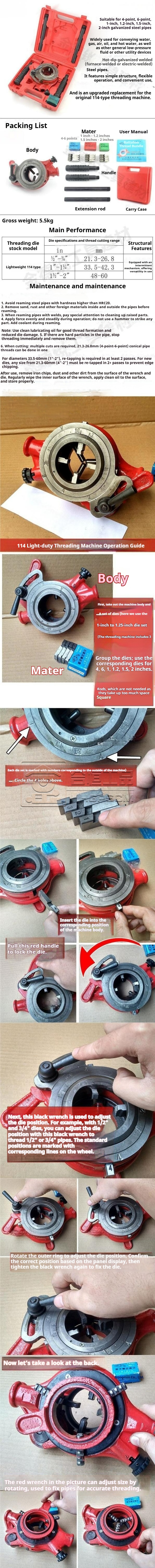 Packing list:1Model 114 Manual Pipe Threading Machine Lightweight Pipe Threading Die Set 1-inch, 2-inch, 50mm
