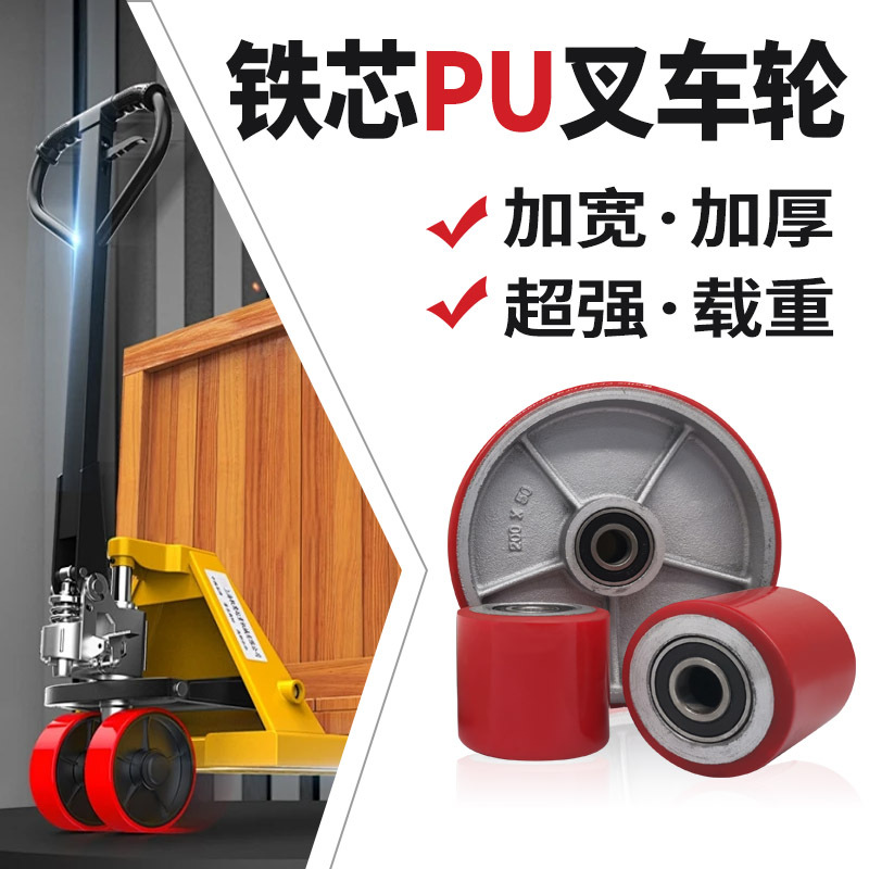 手动液压叉车轮子红色铁芯PU带轴承脚轮高载重低噪音耐磨滚轮滑轮