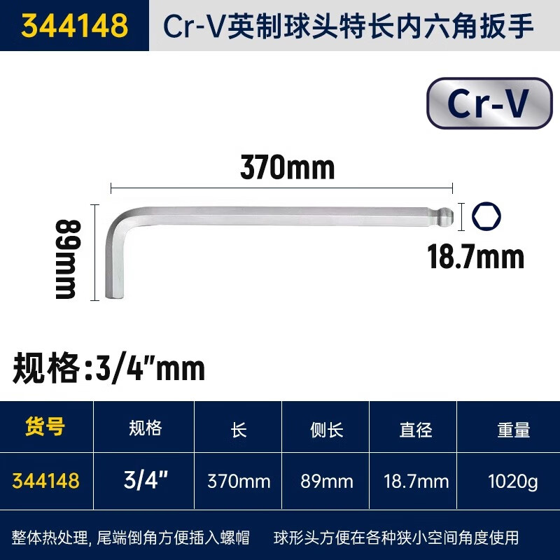 长城精工英制球头特长内六角扳手工具六棱螺丝刀3/32-1/8-/1/2-1/4 【3/4“(CR-V铬钒钢)】