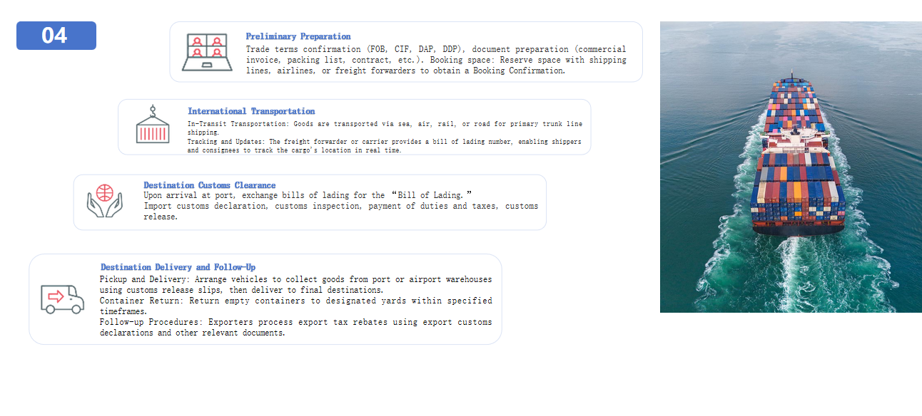 Customs Clearance & Shipping: Handle export customs declarations, arrange international transportation, and manage destination port clearance.