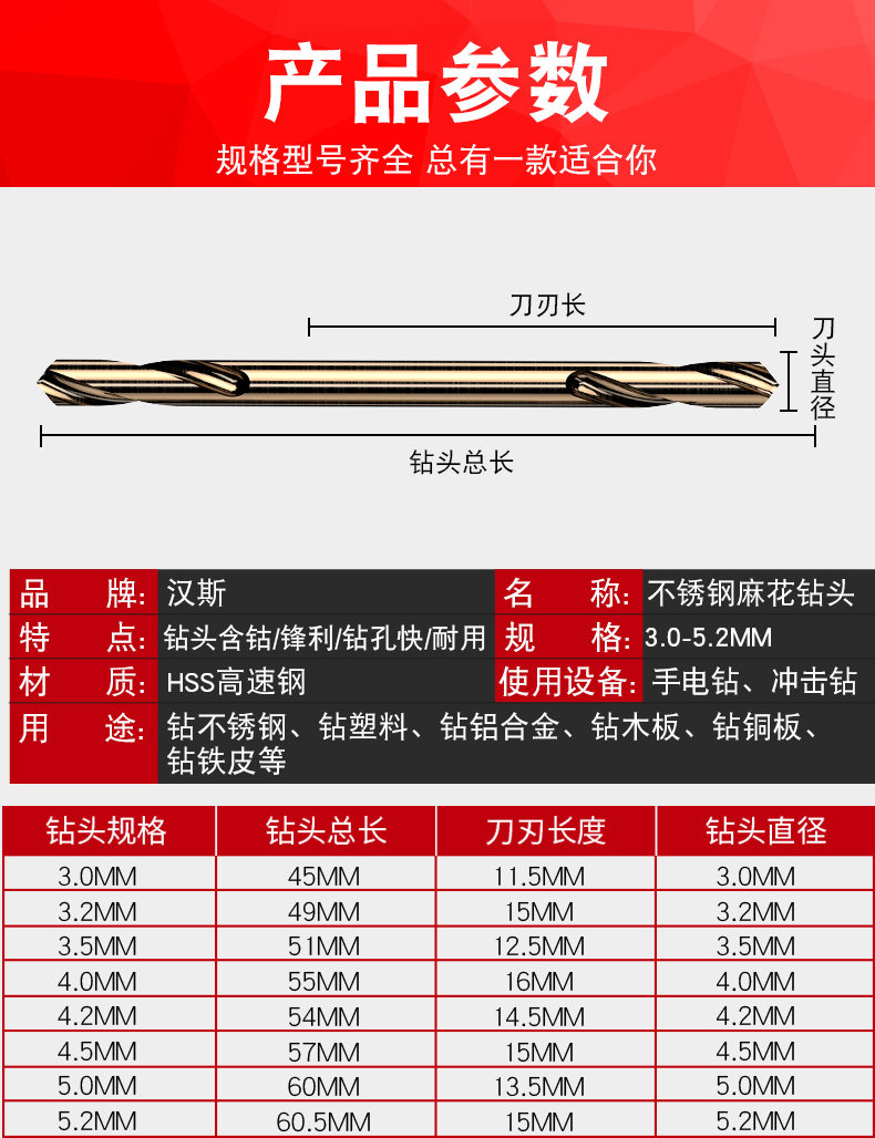 包装清单:1含钴高速钢双头麻花钻头大全双刃不锈钢专用超硬钻铁打孔转头