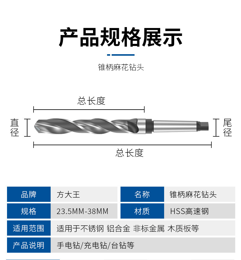 包装清单:1方大王 锥柄钻头莫氏圆锥锥钻 锥柄麻花钻高速钢钻头