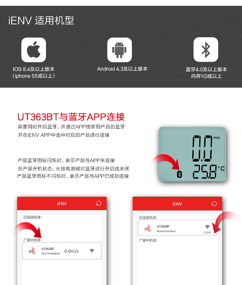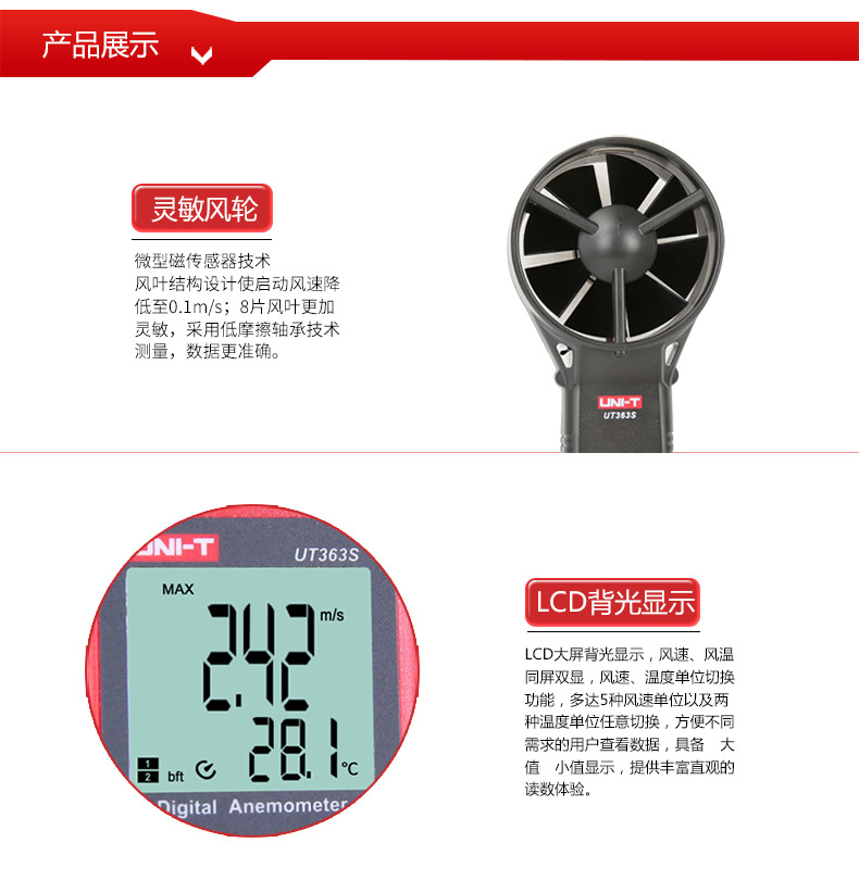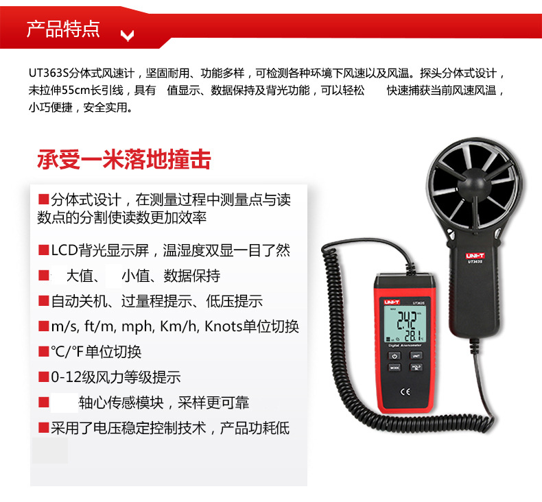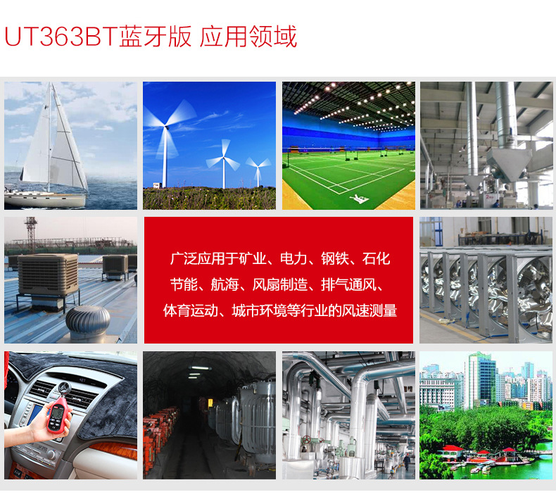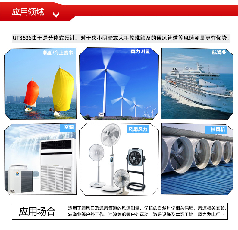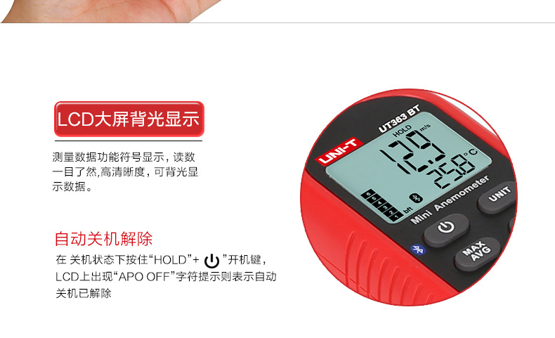 商品名称:优利德UT363/BT/UT363S蓝牙数字风速仪 风量风力风温监测表风速计带蓝牙版/分体式