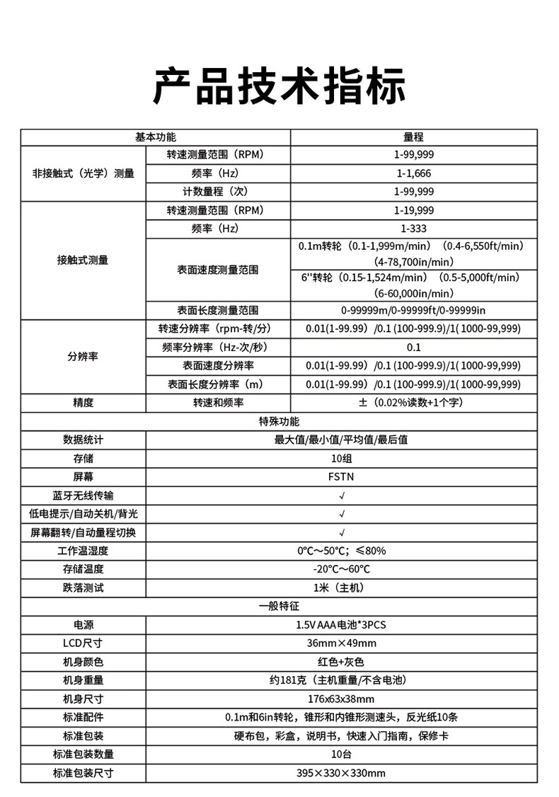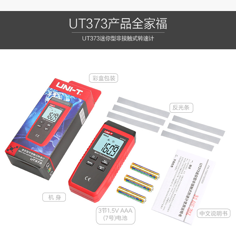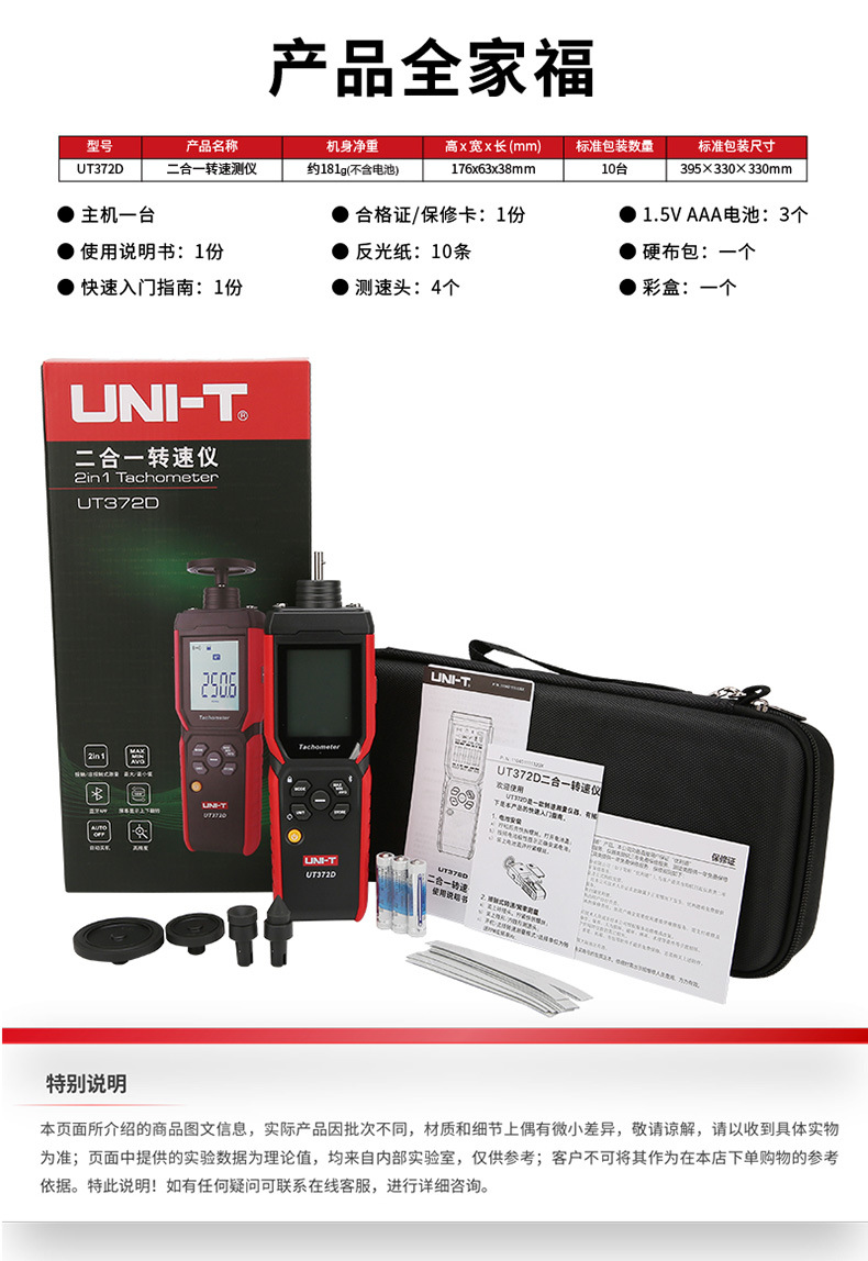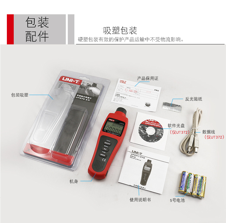 包装清单:1优利德转速表UT371/UT372D数显转速计非接触光电马达电机测转速仪