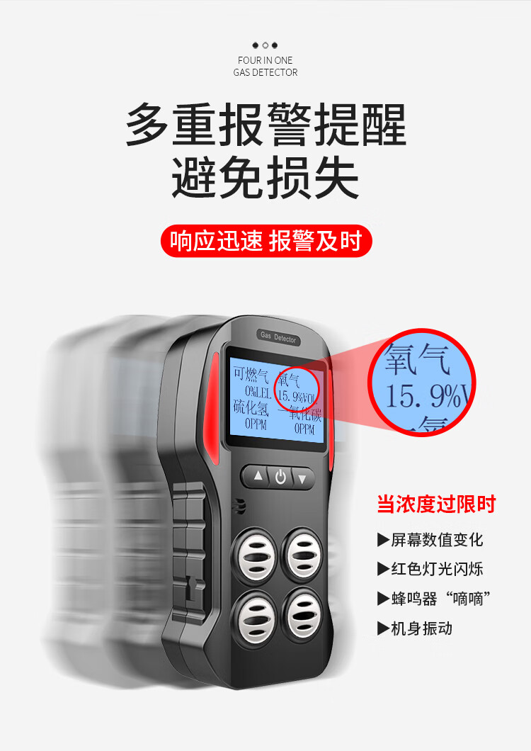 商品名称:四合一气体检测仪便携式氧气CO硫化氢可燃有限空间浓度报警器 四合一(X-4+)