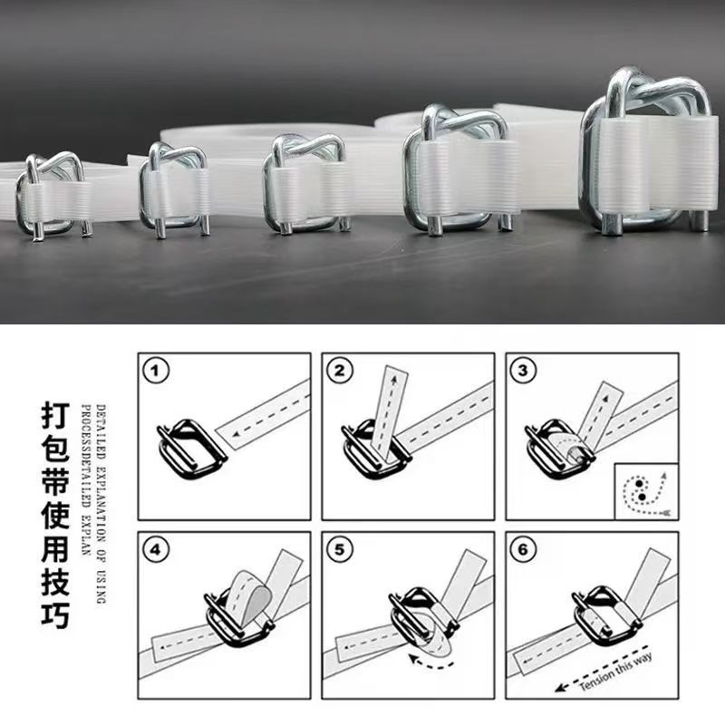 包装清单:1纤维打包带 打包扣 pp重型纤维捆绑带 柔性聚酯纤维打包带捆绑带